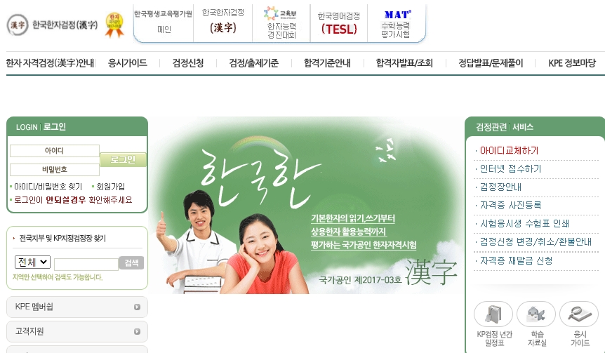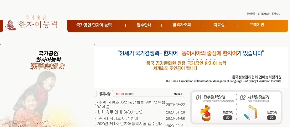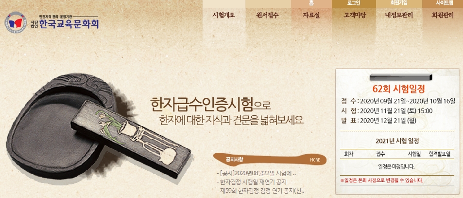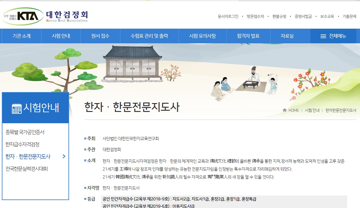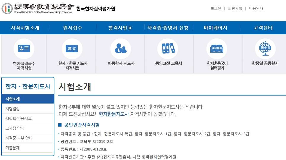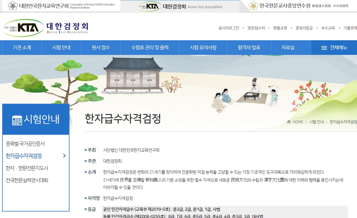 한국어문회에서 주관하고 시행합니다. 특급에서 3급까지는 공인자격, 4급에서 8급은 민간자격입니다. 우리가 보통 알고 있는 한자시험 중에서 가장 대표적인 시험이라고 볼 수 있습니다.