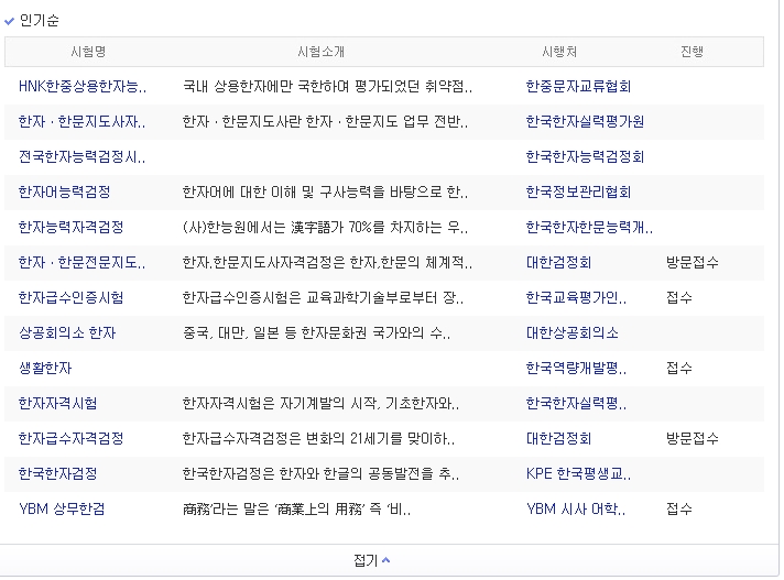 그런데 한자 시험 이라고 검색해 보면 상당히 많은 곳에서 주관하고 있다는 것을 알 수 있습니다. 즉 국가자격증은 아니라는 것인가 봅니다. 상당히 많은 능력검정시험 중 어느 것을 선택해서 자격증을 취득하느냐는 개인적인 부분입니다. 어떤 종류 있는지만 모아보았습니다.