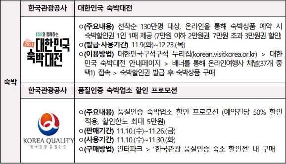 11월 여행가는 달 숙박 할인은 한국관광공사의 대한민국 숙박대전과 품질인증 숙박업소 할인 프로모션으로 이루어집니다. 대한민국 숙박대전은 선착순 130만명을 대상을 온라인 통한 숙박상품 예약 시 숙박할인권은 1인 1매 제공합니다. 12월23일까지 이용할 수 있습니다.