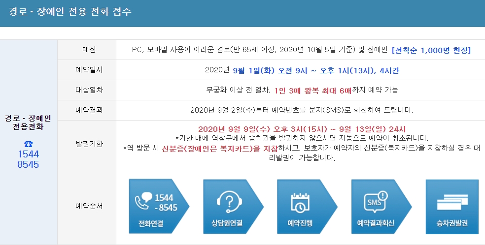 그리고 경로 및 장애인 고객의 경우는 2020년 추석기차표 예매 할 때 미리 코레일홈페이지에서 사전여행정보를 미리 저장한 후 예매당일 불러오는 기능을 이용할 수도 있으니 미리미리 저장해 두세요.