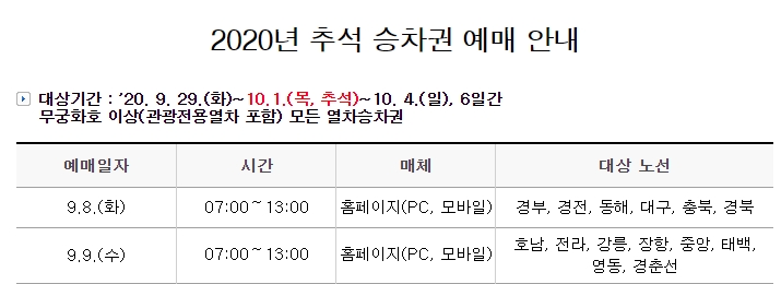 2020년 추석연휴는 9월30일 수요일부터 어쨌든 10월4일 일요일까지입니다. 그리고 추석기차표 예매는 9월29일부터 10월4일까지 6일간이 대상기간입니다.